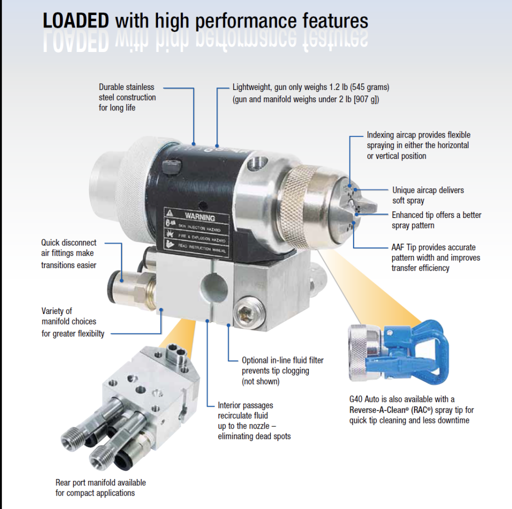Автоматичния бояджийски пистолет Graco G40 auto е идеално решение за клиенти търсещи високо качество на крайното покритие и възможност за нанасяне на гъсти или силно агресивни материали.