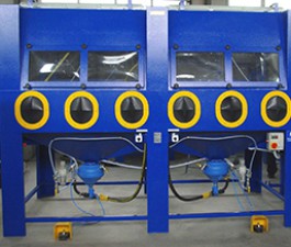 Унгарския производител на бластиращо оборудване предлага пясъкоструйни кабини. Работните габарити на кабините се предлагат спрямо изкисванията на клиента за размера на почистваните детайли. Основната конструкция на кабините е изработена от стоманени профили и листа с мин. дебелина 1,2мм. Вътрешните стени на кабината са покрити с износоустойчиво покритие за гарантирано дълго време на експлоатация. За пречистването на праха от почистване може да се използват или вградени в корпуса филтърни аспирационни системи или отделно стоящи. Кабините могат да бъдат и с опция за позване на две работни места. Спрямо използвания материал за почистване функционално може да бъде с инжекторно или чрез съд под налягане подаване на абразива. Материала за почистване може да бъде – кварцов пясък, стоманени дробинки, корунд или стъклена перла, алуминиев оксид. Типично приложение е почистване на черна стомана, неръждаема стомана, алуминий, състаряване на дърво и други приложения.